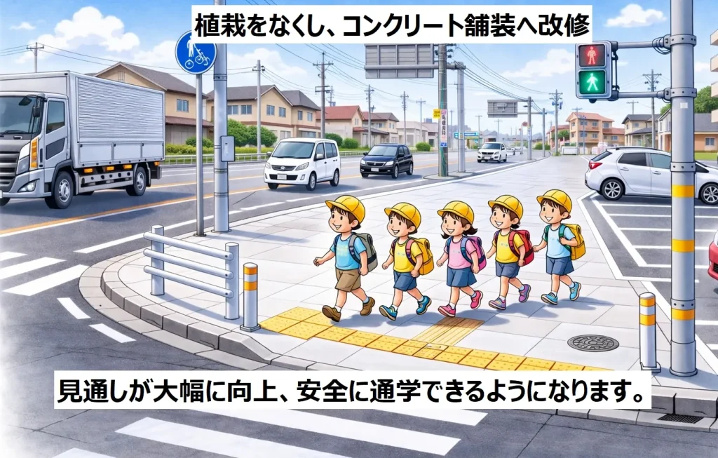 今回の改修により見通しが大幅に向上し、より安全な通学路の確保につながります。