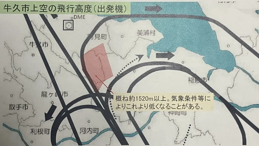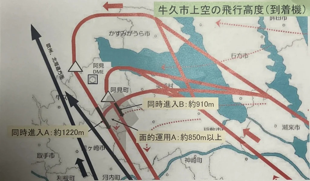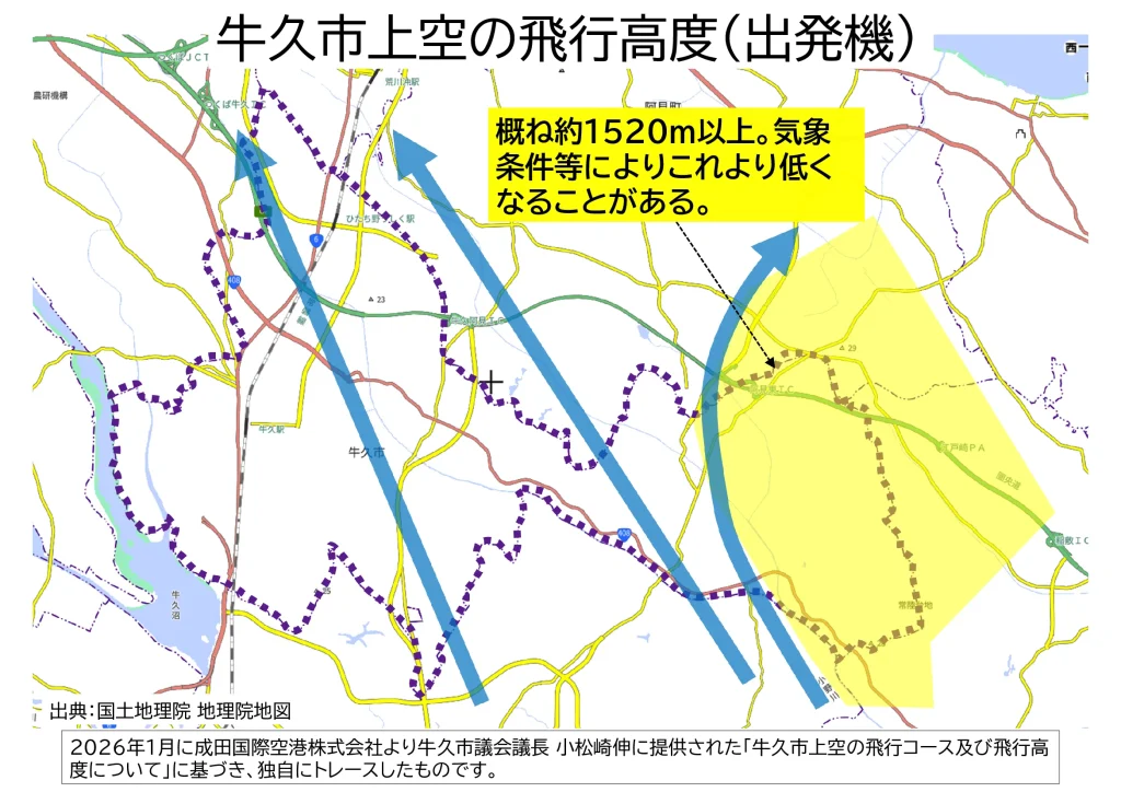 ※この地図は、2026年1月に成田国際空港株式会社より牛久市議会議長 小松崎伸に提供された「牛久市上空の飛行コース及び飛行高度について」に基づき、独自にトレースしたものです。